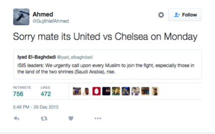 Middle East Eye, Muslims tweet why they are too busy to answer IS ‘rise-up’ call, Available from: http://www.middleeasteye.net/news/muslims-twitter-explain-why-theyre-too-busy-answer-call-rise-535380720 [27 December 2015]