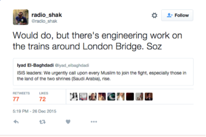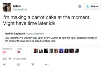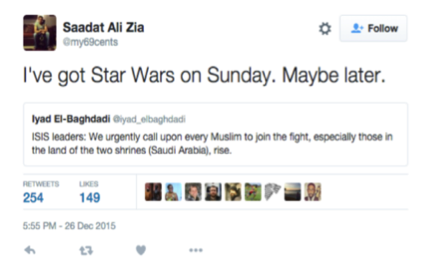Last December, the leader of the Islamic State posted portions of a call-to-action on Twitter intended for Muslims around the world. The words were cut from an audio recording, in which Adu Bakr al-Baghladi declared that taking up arms and “joining the fight” urgently is incumbent on each individual Muslim. However, many Muslims on Twitter found the demand hilarious and reacted to this call to “rise up” with humor, with many complaining that the call came at an inappropriate time as they were busy with a lot of other activities, such as watching Star Wars and following football (Middle East Eye 2015).
