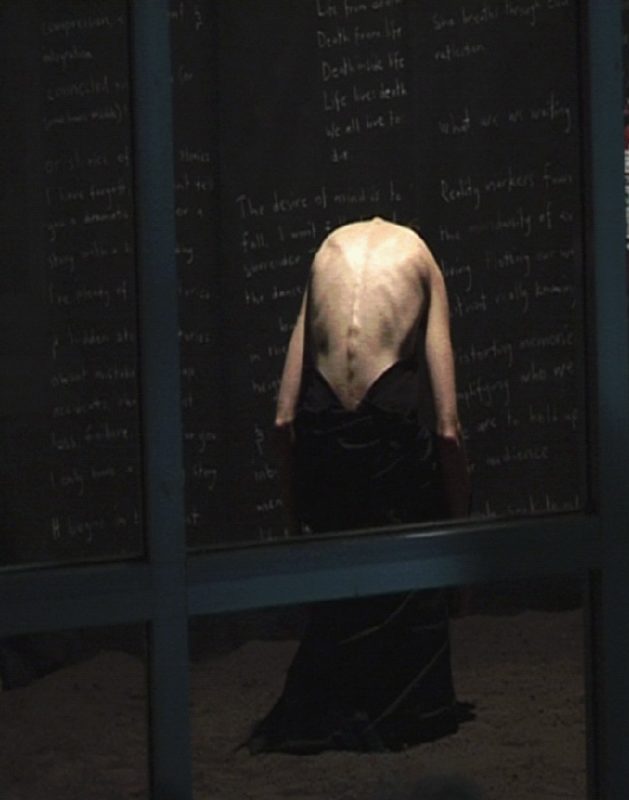 Enclosed in the glass foyer reminiscent of shop front displays, surrounded by black paper walls covered with writing (my implicit and imagined history) and dirt covered ground (innate nature), I revealed a multi-layered experiencing of self-image. I slowly revealed the skin of my bare back (explicit body) before disappearing into the blackness of the night/earth. After which the audience were invited to walk through this same room where they were invited to connect with a dialogue between their inner world of perceptual, sensorial and corporeal imaging and the environment they were entering into. In the immediacy of the inter-sensory and inter-corporeal arriving-in-performance there was a heightened awareness of how body images are held within a fluctuating sphere of being as opposed to fixed notions or pre-existing memories.