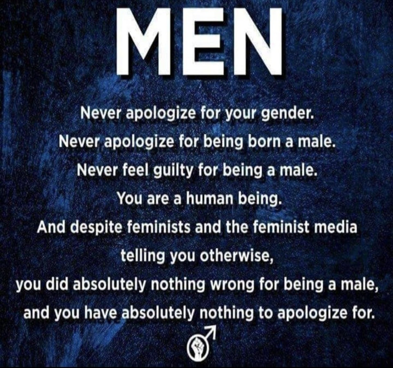 Figure Two is an example of the type of meme posted from the subreddit on Reddit r/MGTOW (Men Going Their Own Way). Members of MGTOW believe that relationships with women are so detrimental to men, that men must remove themselves from relationships entirely. They should ‘go their own way’. In this meme we can see a defense against the so-called attacks men have faced from feminism in particular in recent decades, with the final line that “you did absolutely nothing wrong for being a male and you have absolutely nothing to apologize for.”
